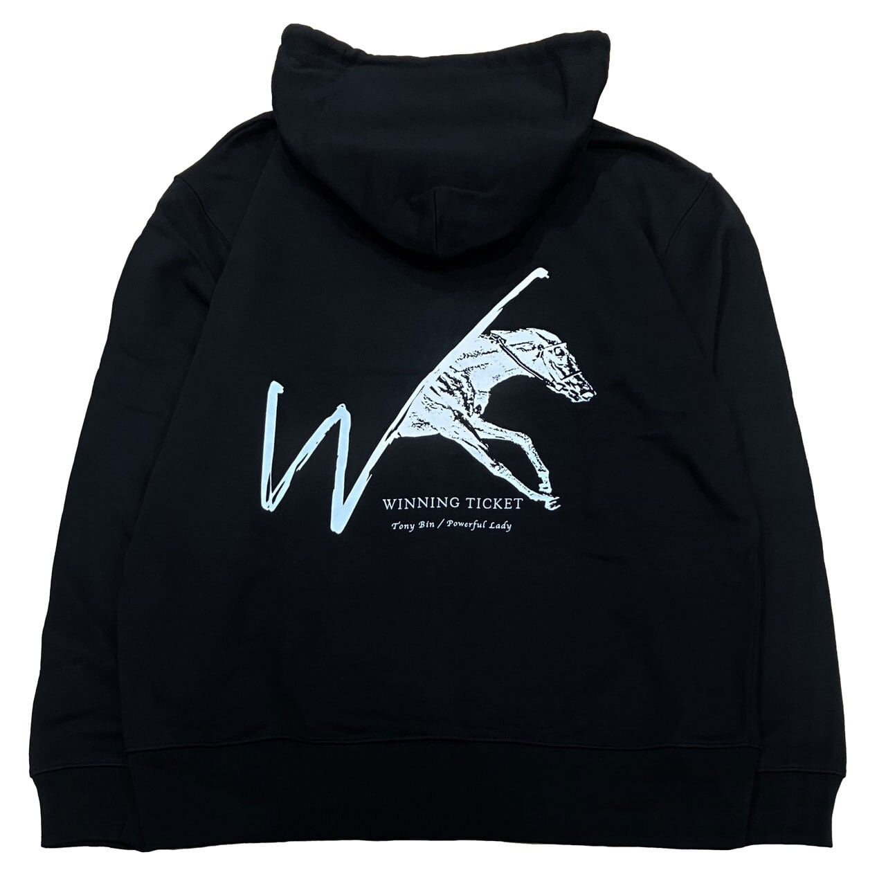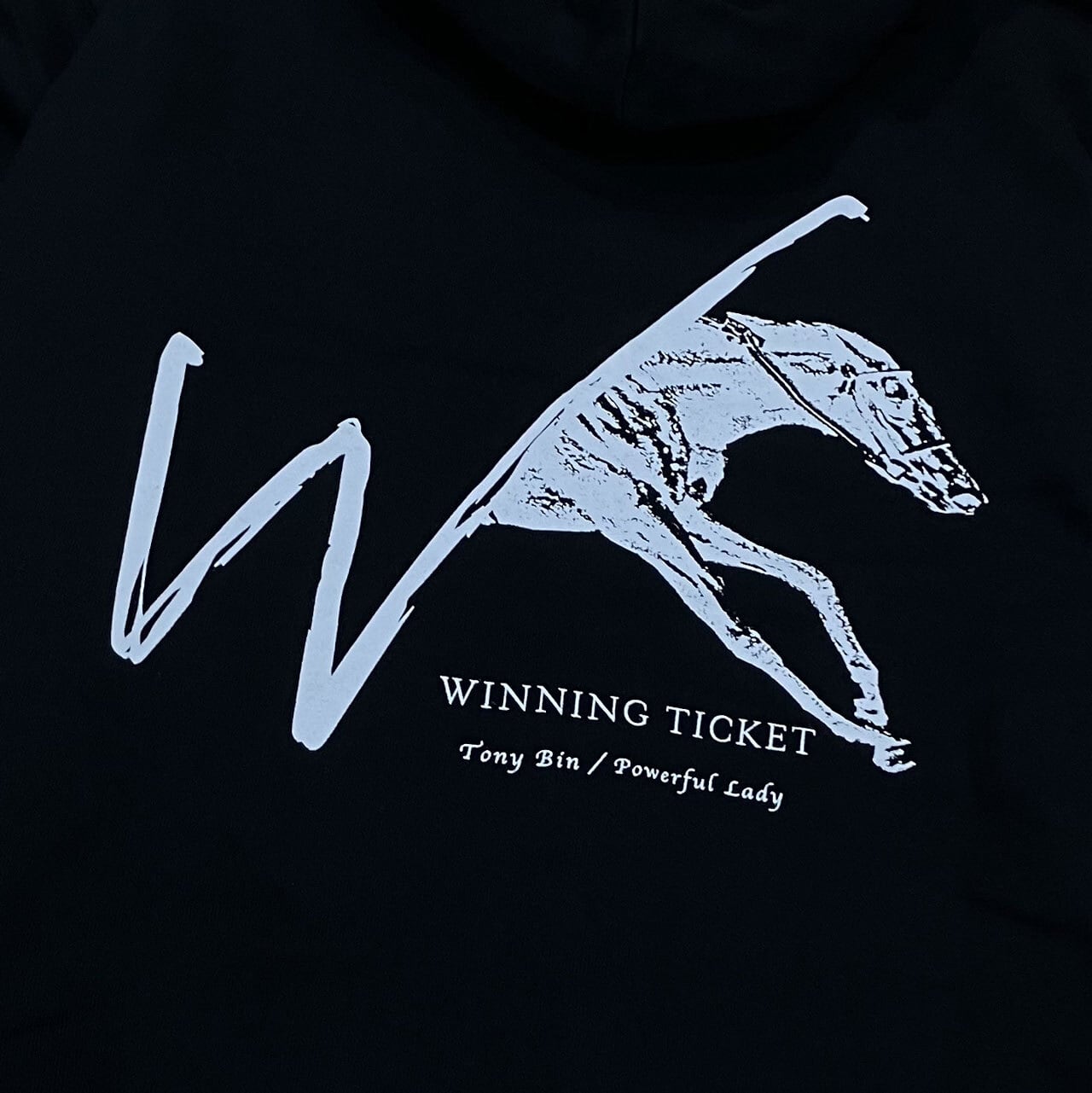 背中にはウイニングチケットの勇姿がプリントされ、胸元には浦河アエルのロゴマークが贅沢に刺繍されたジップ型のパーカーです。
